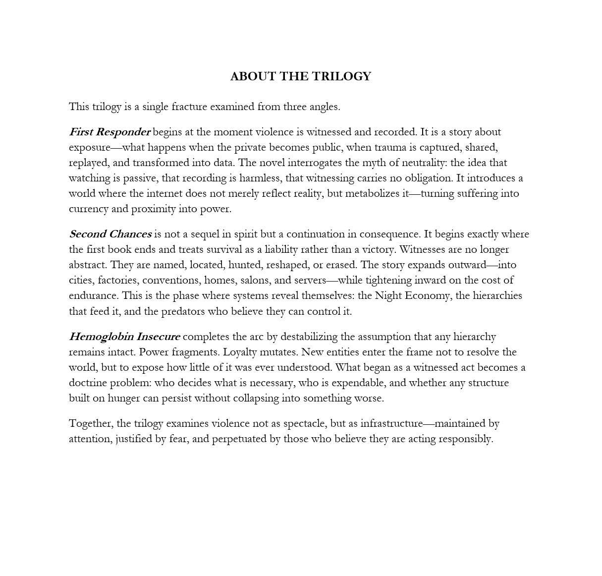This page is built to show the novels at the page level — not just as titles, but as visible, structured, internal realities. Each section can be expanded over time as more support pages, visual excerpts, and related material are added.